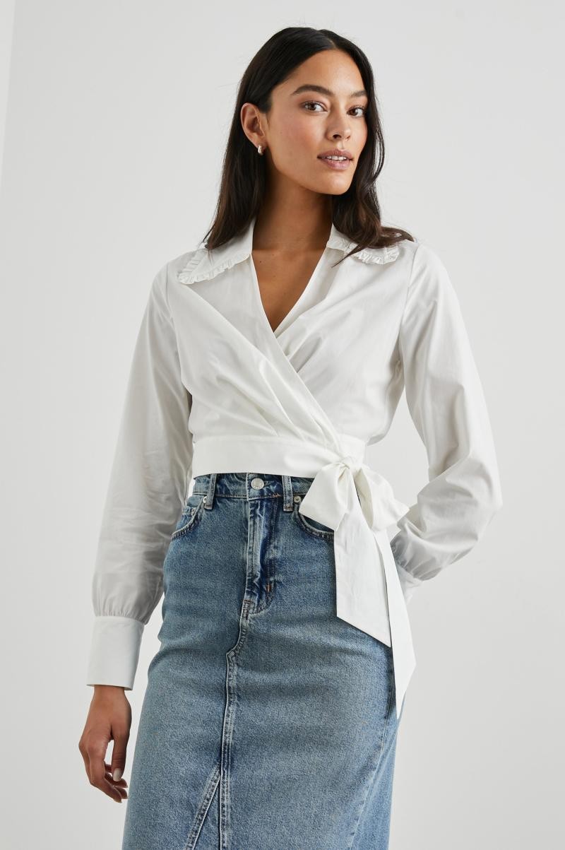 Tričko Bali, odvážnější verze klasického bílého topu s knoflíky, se vyznačuje zkráceným střihem, volánkovým límcem a plně ovinutým pasem.
