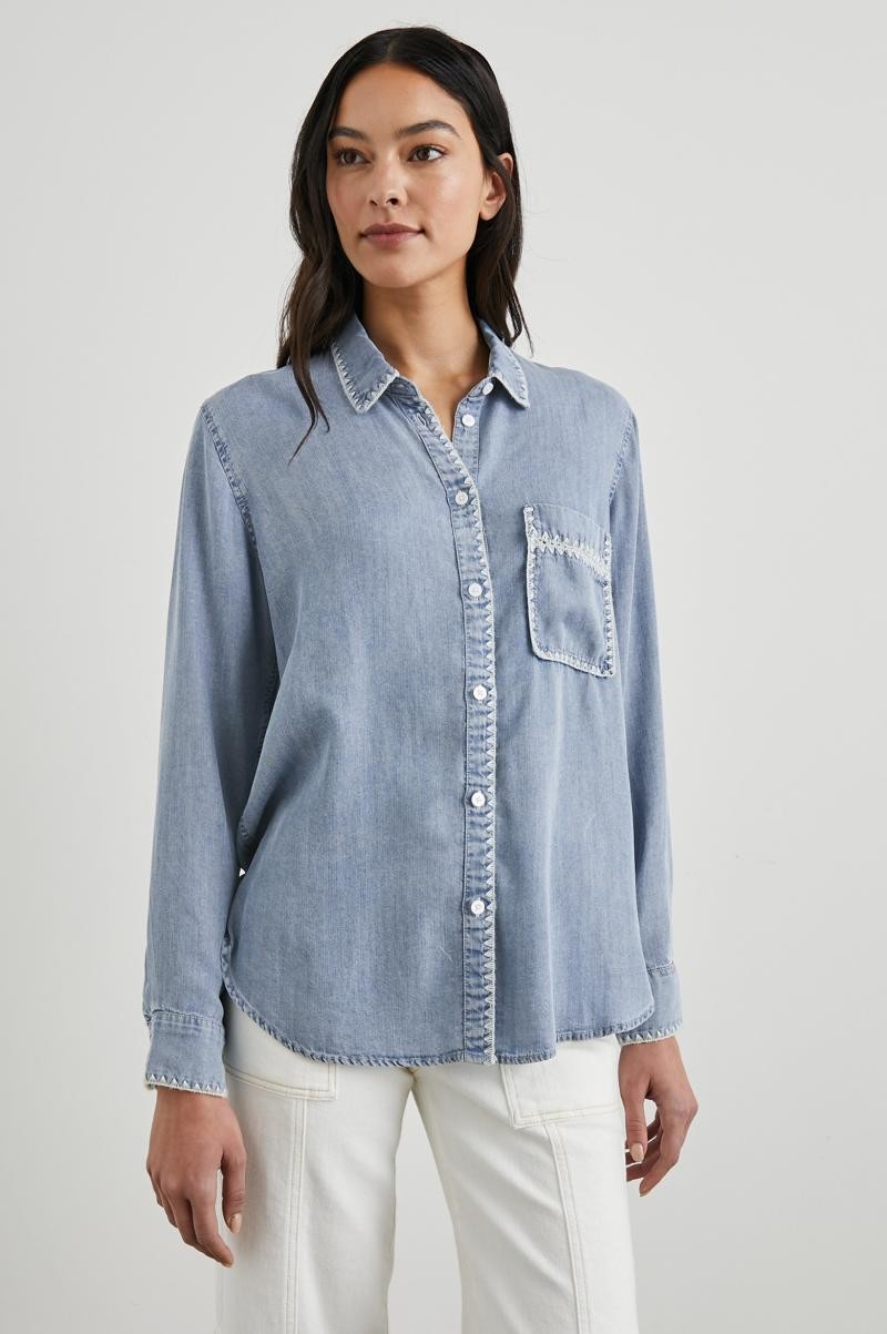 Με βάση την κολακευτική εφαρμογή του πουκαμίσου Charli, το Saya είναι κατασκευασμένο από εξαιρετικά απαλό τζιν tencel και διαθέτει ειδικά κεντήματα. Είναι αρκετά ευέλικτο για να το δέσετε, να το βάλετε στο πλάι ή να το φορέσετε πάνω από ένα μπλουζάκι.