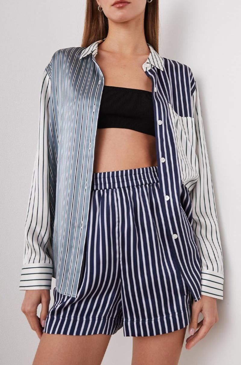Tógann Léine Spencer leideanna ó éadaí na bhfear le cnaipíní fairsinge, suaimhneacha san fhabraic is sómasach. Tá éagsúlachtaí stríoca paisteáilte le chéile, póca paiste rómhór, agus fad drámatúil uirthi. Déanta as síoda mín, sreabhach, smaoinigh air mar do rogha nua don séasúr.