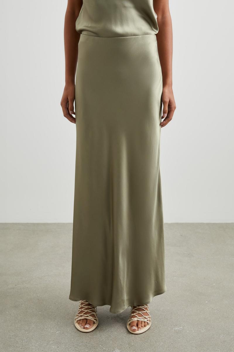 サテンクレープスカートなしではクローゼットは完成しません。Rominaはまさにその役割を果たします。ほぼ虹色のグレイッシュグリーンで展開されるこのスタイルは、隠しゴムウエストバンドと楽なバイアスカットが特徴です。