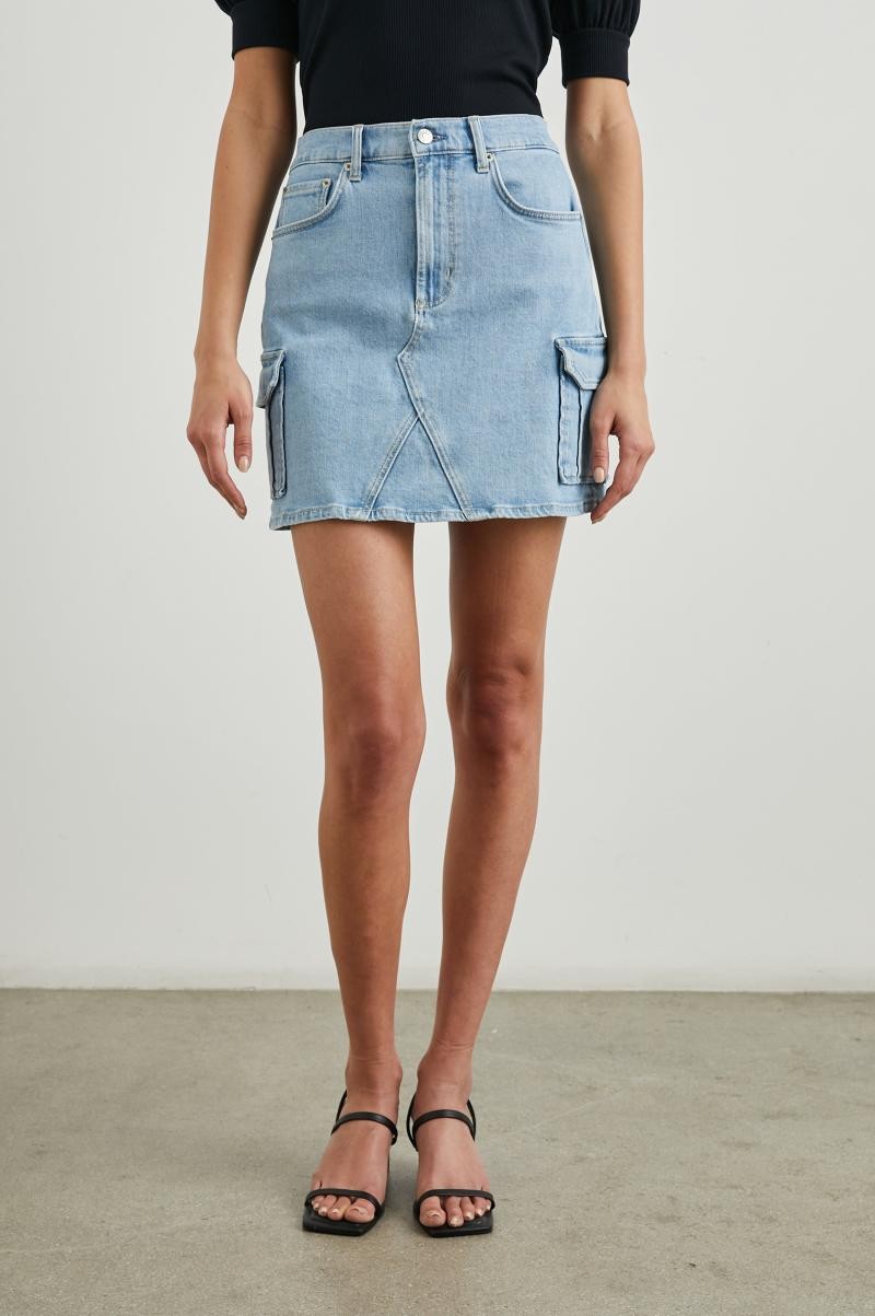 Möt din nya sommarklassiker. Laurel Cargo är en klarblå, tvättad minikjol med hög midja, gylf med dragkedja och cargofickor. Stoppa in en t-shirt, t-shirt eller linne för en direkt varm och väderklar outfit.