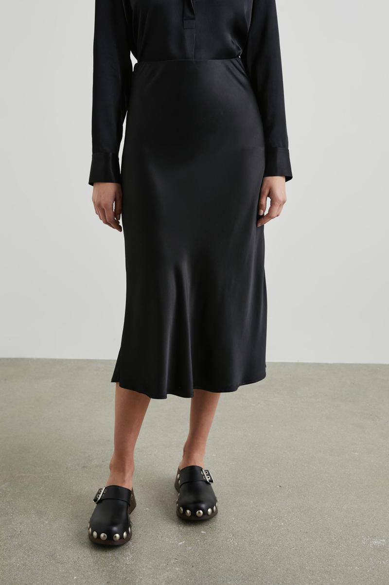 Super smooth, satin crepe, high-rise, unlined, sleek black midi skirt featuring black exposed elastic waistband, swingy fit, and flattering bias cut. Made with luxurious fabric in an easy pullover silhouette, this swingy skirt is perfect for work or play.