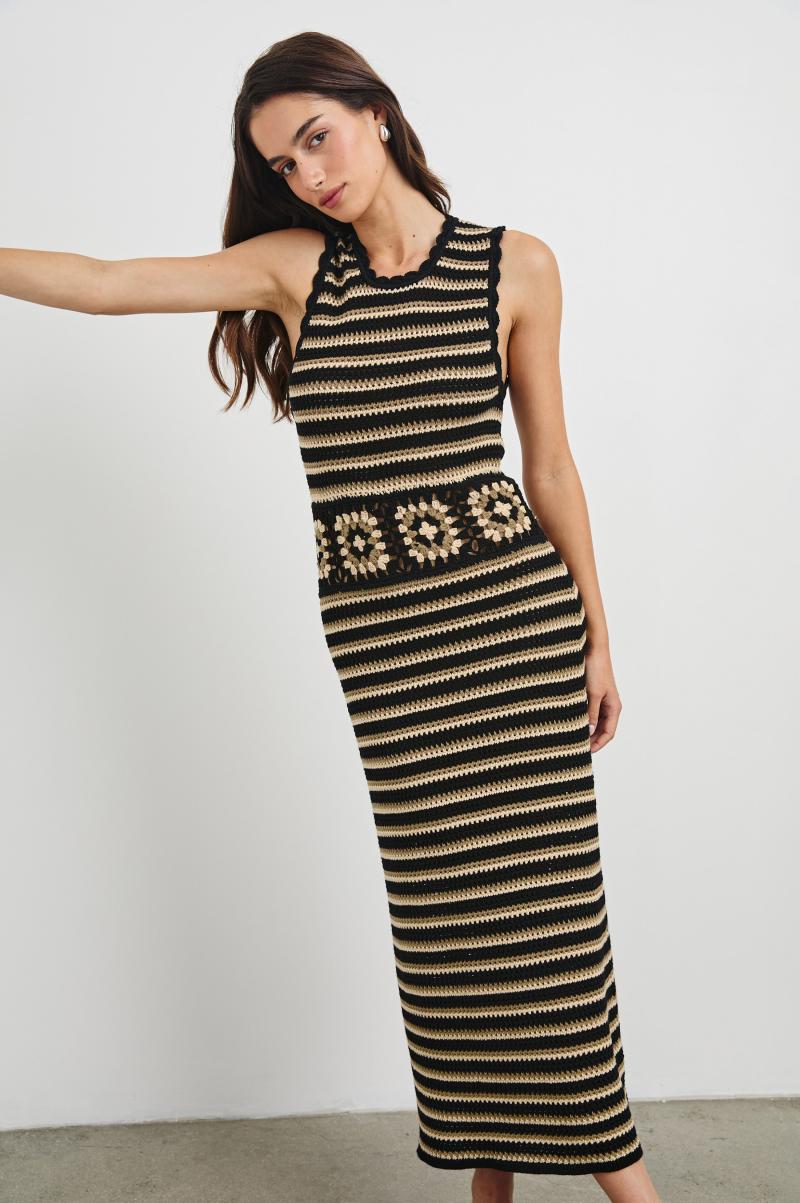 The Coco is a midi length dress, featuring cotton crochet knit details at the waistline. Finished with an a-line hem.