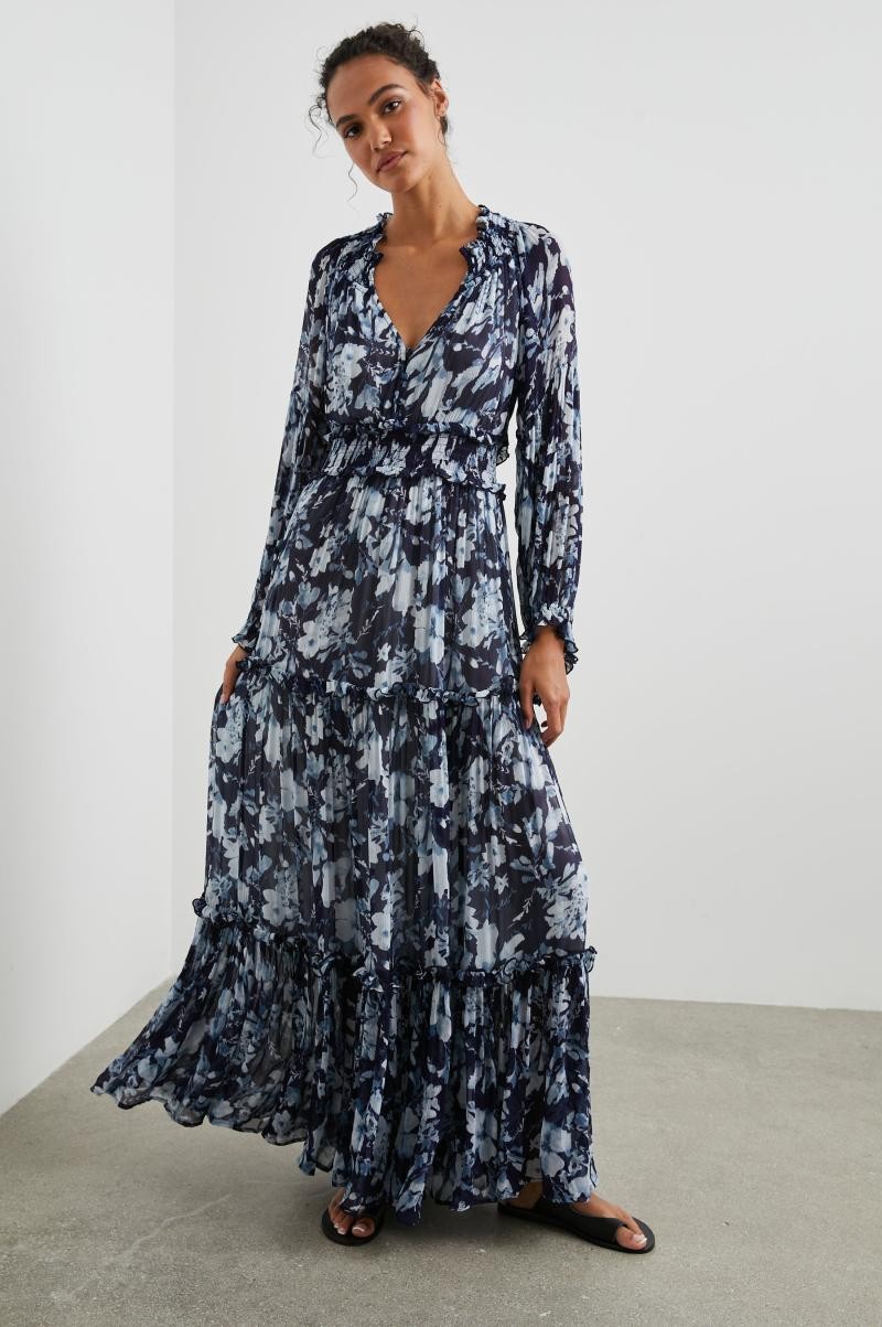 Prepare to turn heads in this chiffon maxi that sways with every step. Done in a one-of-a-kind indigo floral print, Frederica can be dressed up or down to suit your plans.