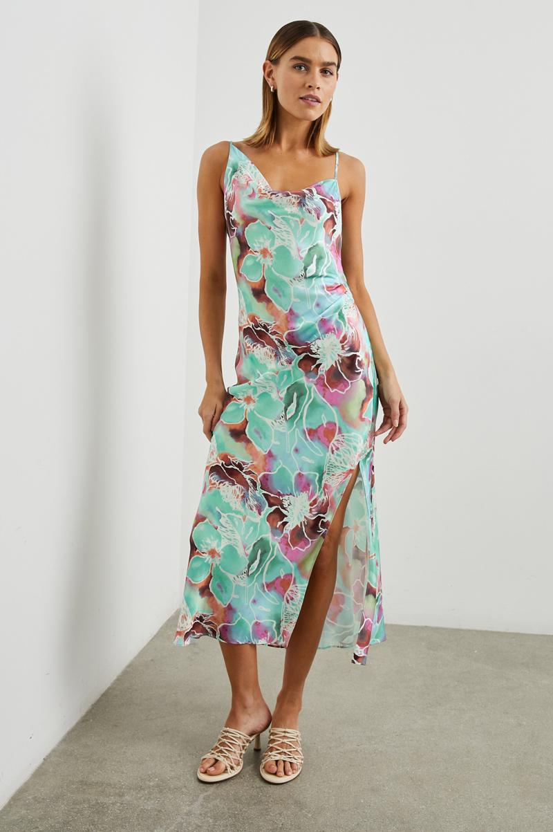 Get into vacation mode with the Jackie, our island-inspired midi dress. Unlined for a body-skimming fit, the Jackie features a cowl neck with a pleated side and thigh slit in a watercolor floral print — perfect for warmer nights in the tropics.