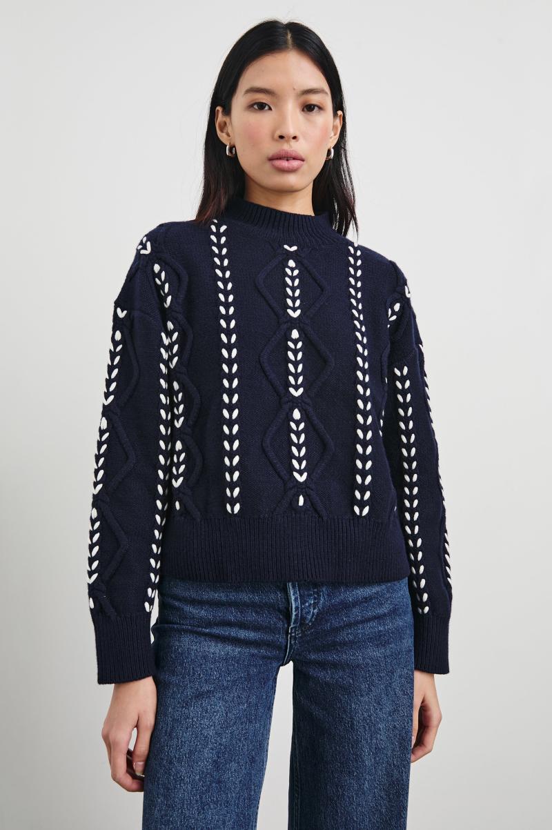 The Tori is an elevated take on the cable sweater, crafted from a heavy wool blend with a white contrast ribbon stitch, ribbed mock neck, and boxy fit.