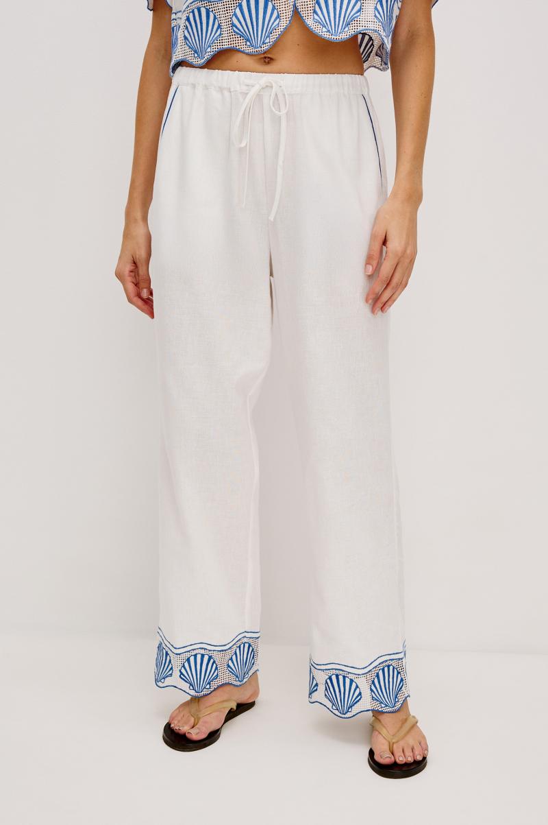 The Tildi pant is made from luxe linen fabric, and features a relaxed fit and drawstring closure. Finishing touches include a scalloped hem with delicate seashell embroidery.